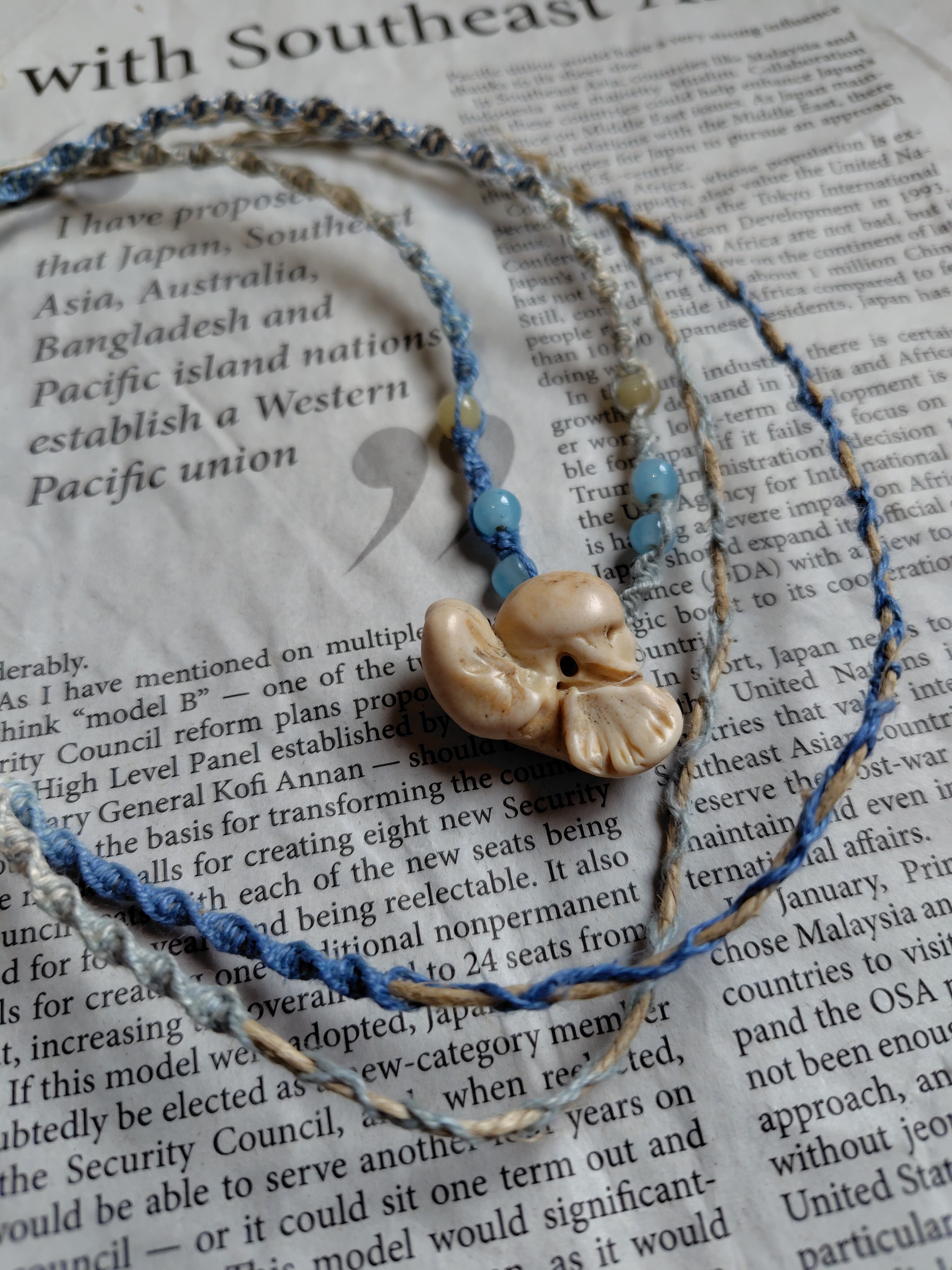 長い時間と自然の力で磨かれたイルカの耳骨の布袋石の部分とグラスビーズを、グラデーションヘンプで編みこみました。