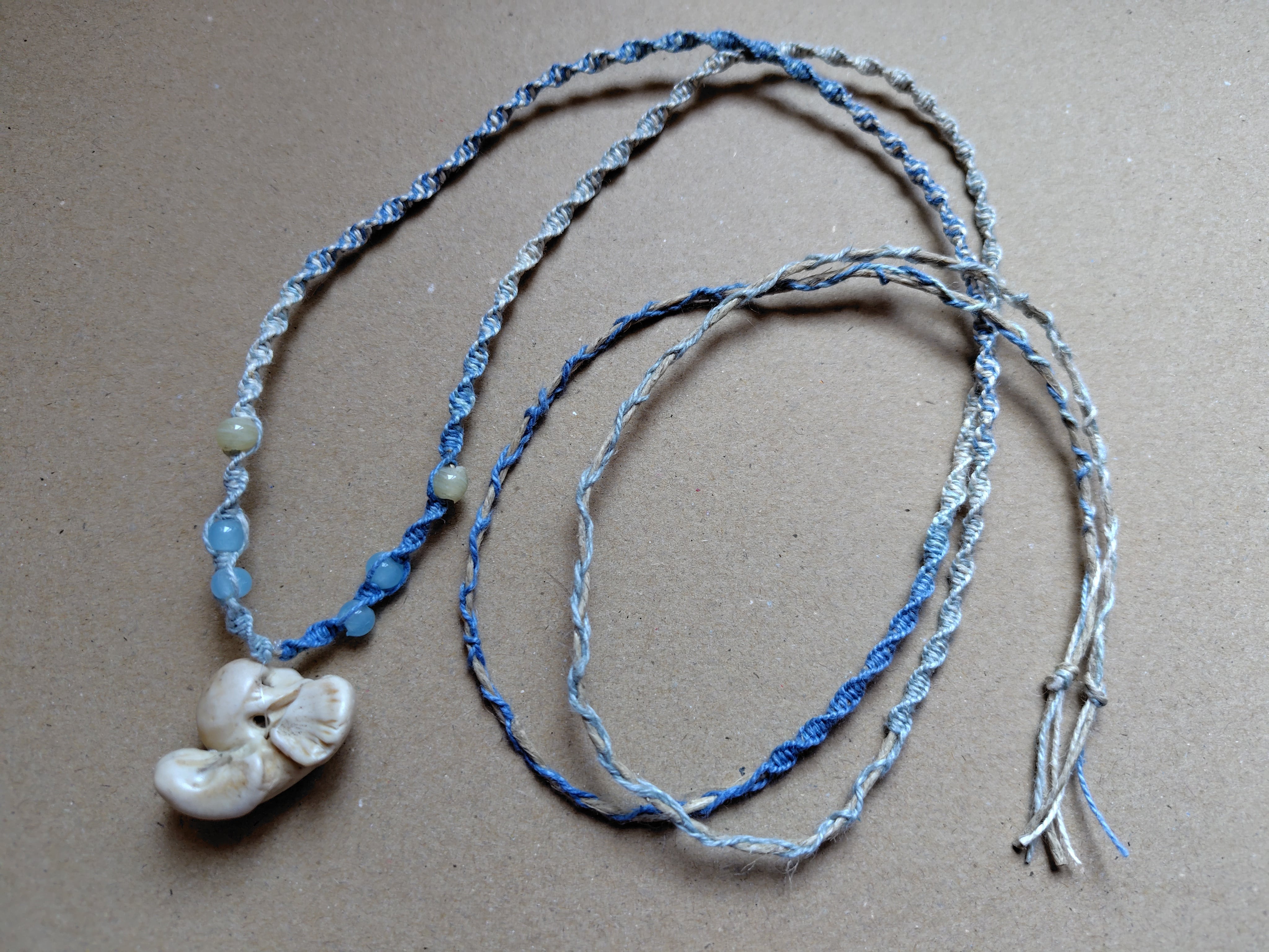 もともと神経の通っていた穴にヘンプと釣り糸を通して作りました。