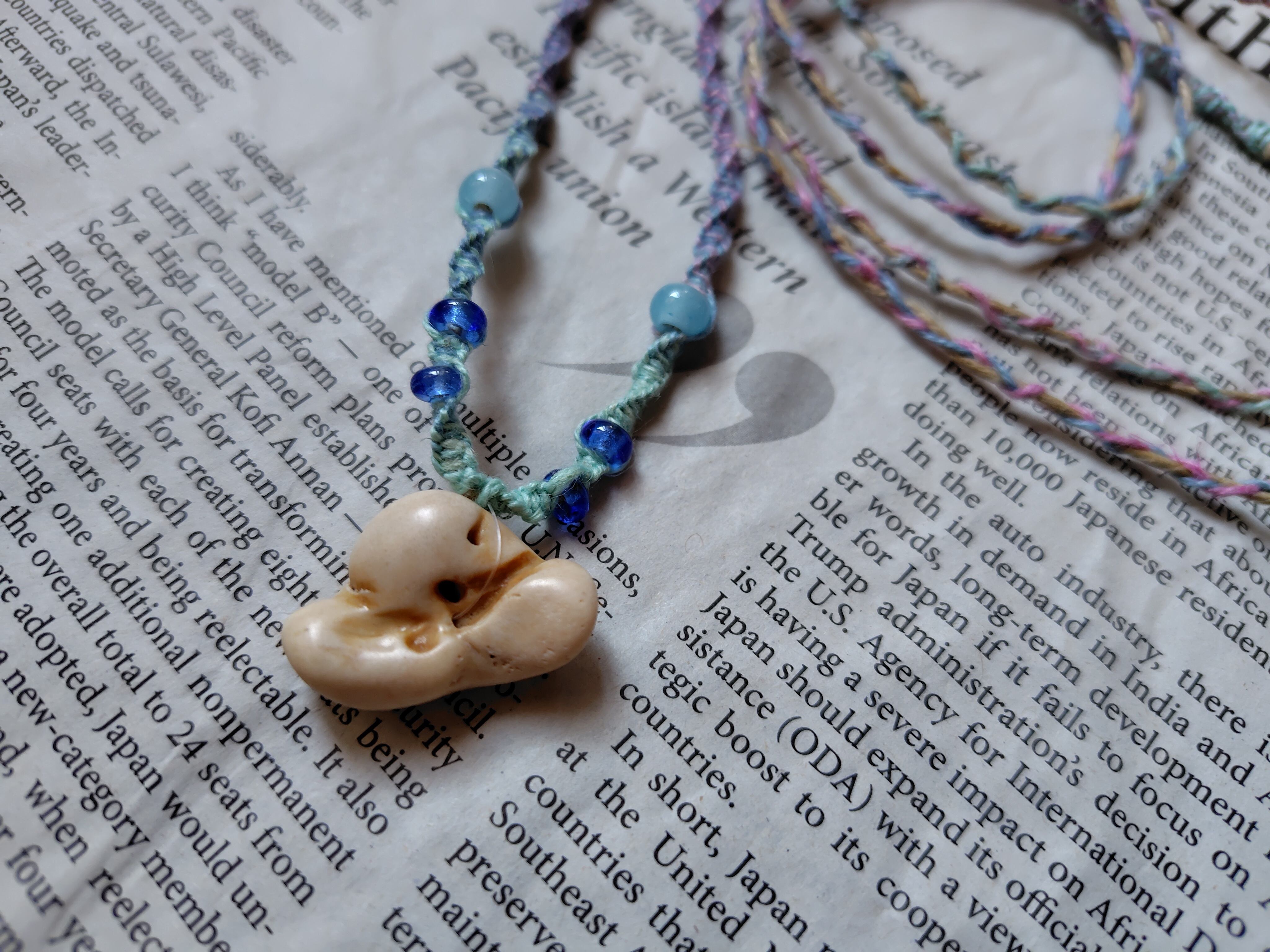 長い時間と自然の力で磨かれたイルカの耳骨の布袋石の部分とグラスビーズを、グラデーションヘンプで編みこみました。
