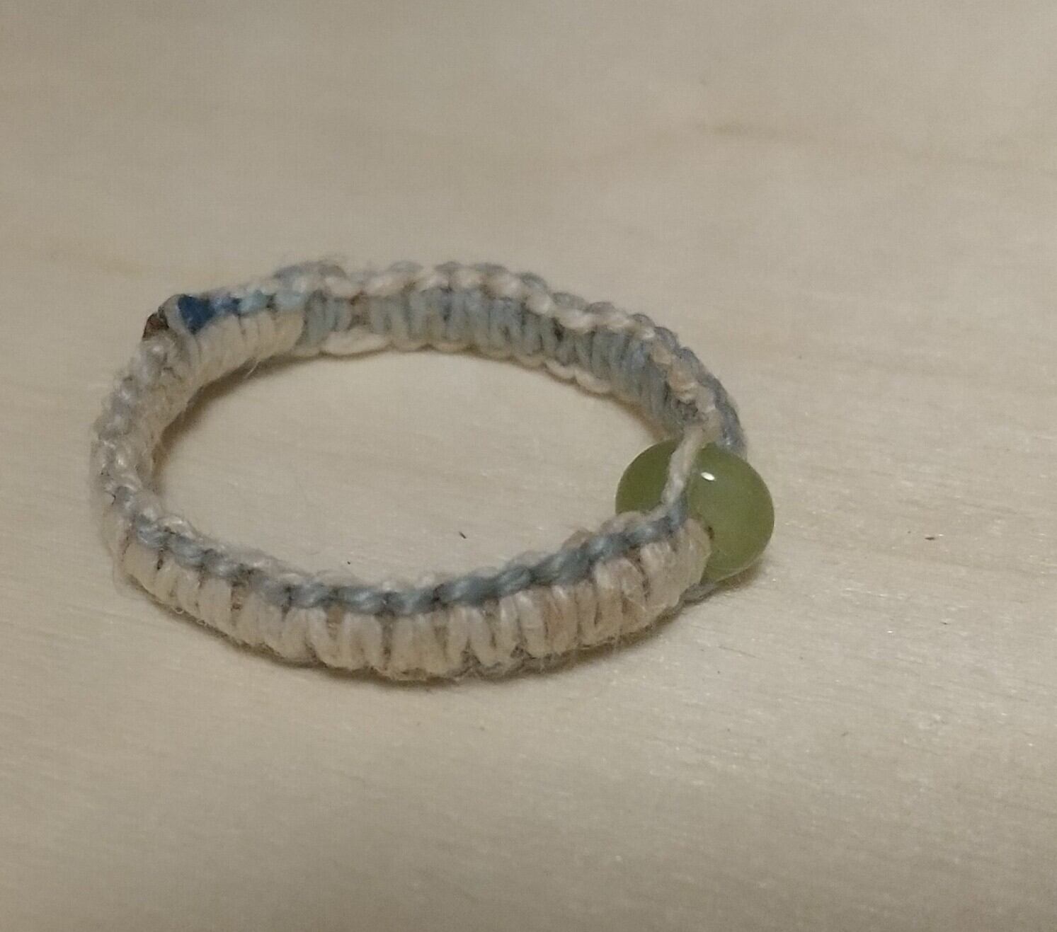 グラデーションヘンプでグラスビーズを編み込んだ指輪です。早朝のもやの中の葉っぱがキラリ!